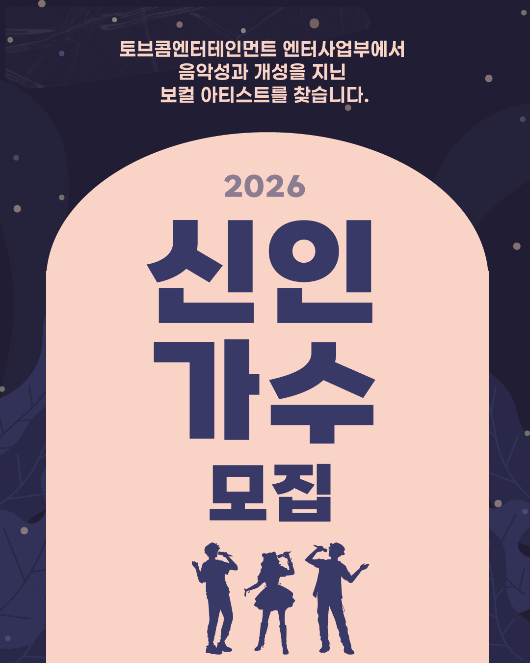 2026년도 신인가수 모집 토브콤엔터테인먼트 엔터사업부에서 음악성과 개성을 지닌 보컬 아티스트를 찾습니다. 활동 내용 함께할 아티스는 아래와 같은 프로젝트에 함께하게 됩니다. -음반제작 -음반 쇼케이스 -미디어 홍보 활동 -지역문화축제 공연 -군부대 위문공연 -연말 콘서트 -기획공연 애니음악 코스튬 공연(5월 가정...